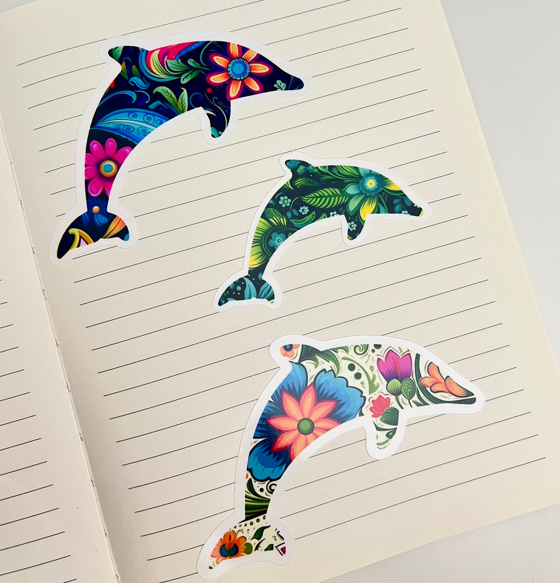 Vinyl waterproof sticker of a floral dolphin silhouette, perfect for laptops, cups, and notebooks.