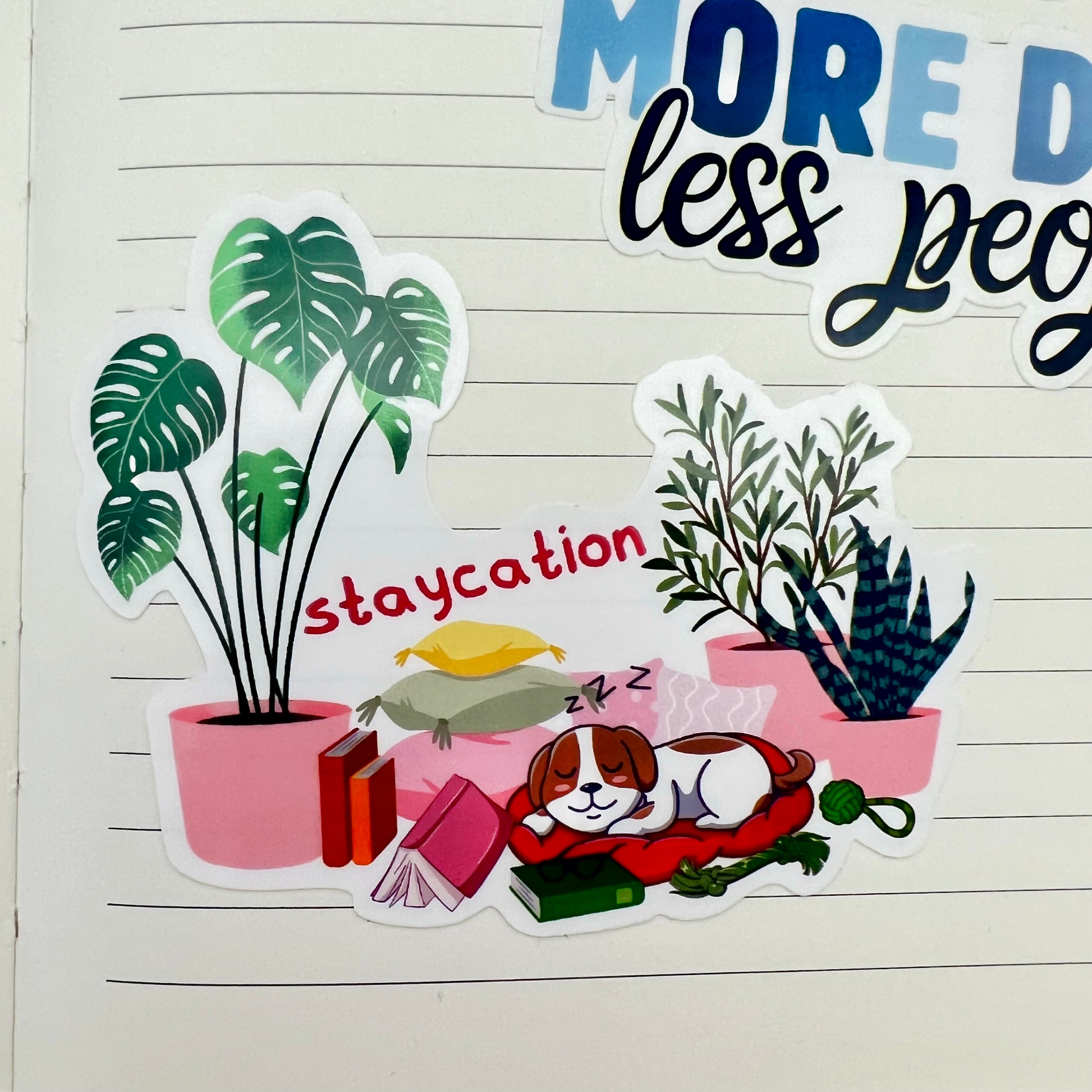 Vinyl waterproof sticker with the word "staycation" next to a sleeping dog, perfect for laptops, cups, and notebooks.